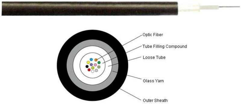 The optic fibers are positioned in a loose tube made of high modulus plastics. The tube is filled with filling compound to give the fibers excellent water proof performance. The glass yarn between the jacket and loose tube is a strength member and provides rodent resistance. Cable is completed with a polyethylene (PE) jacket.